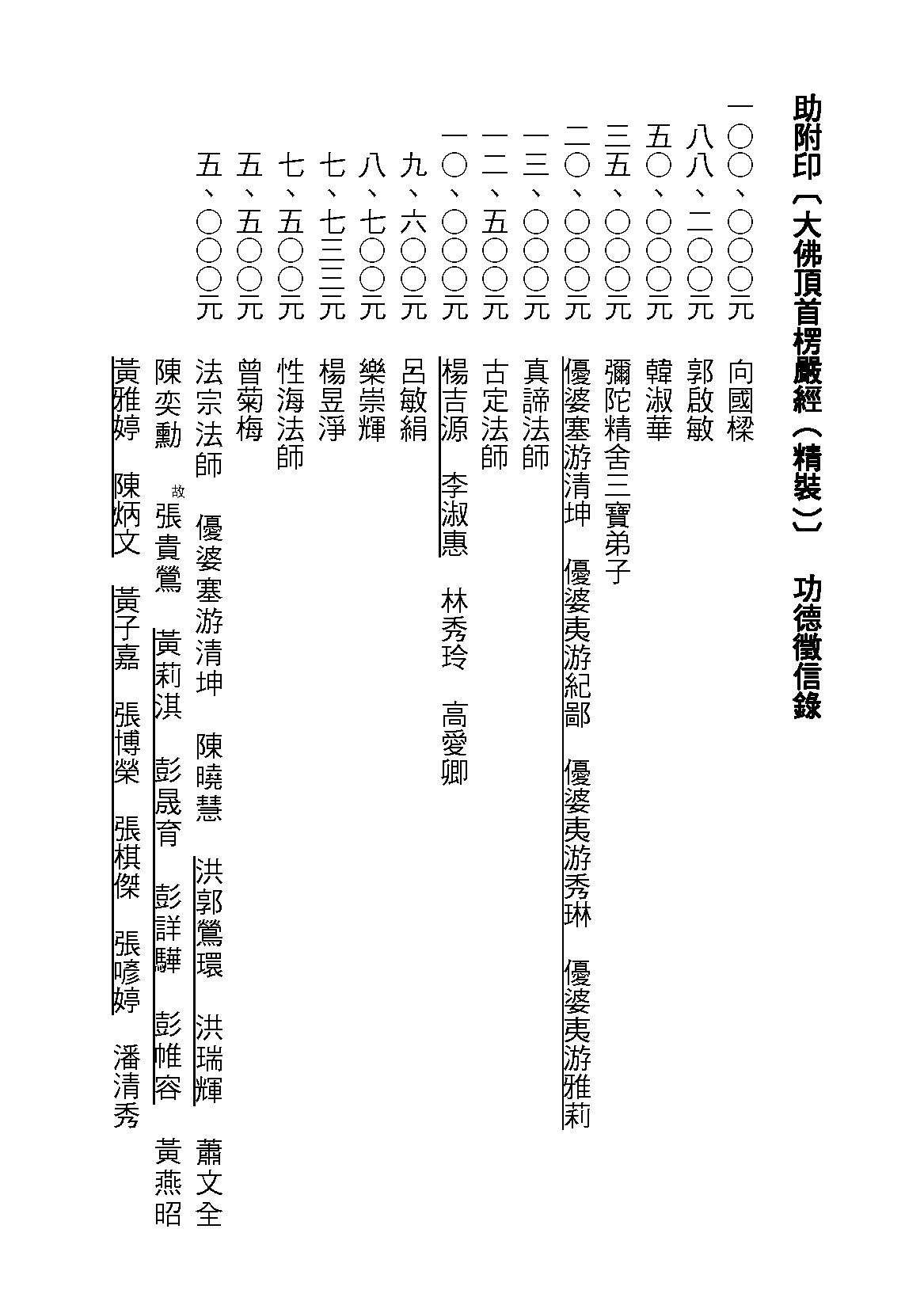 五、○○○元 法宗法師 陳曉慧 (洪郭鶯環 洪瑞輝) 優婆塞游清坤 蕭文全 陳奕勳 (故:張貴鶯) (黃莉淇 彭晟育 彭詳驊 彭帷容) (黃雅婷 陳炳文) (黃子嘉 張博榮 張棋傑 張喭婷) 潘清秀 黃燕昭