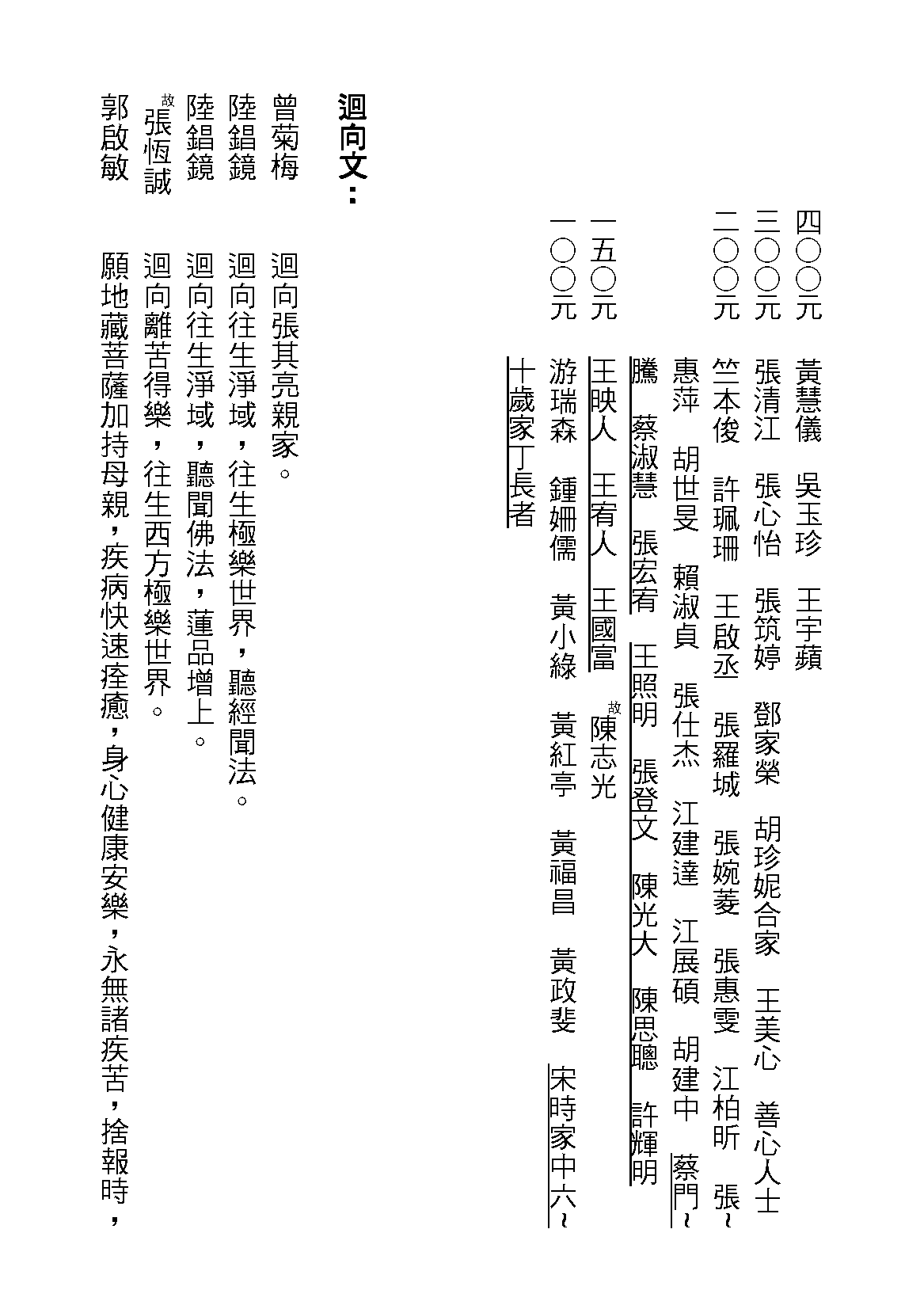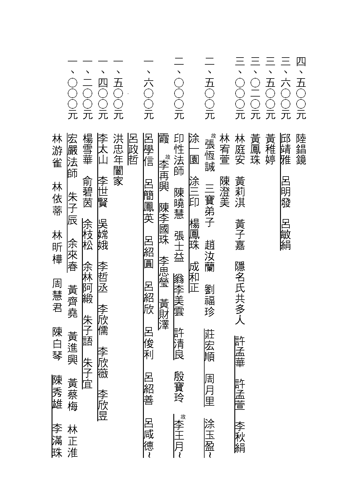 五○○元 真理法師 陳明道 陳易鎔 林欣萱 林佳諭 三寶弟子 三寶弟子 陳宜輝 曾阿幼 陳月英 郭雅薰 謝春珠 葉曼青 許英珠 張嘉玲 陳清花 洪朱猛 張貞容
