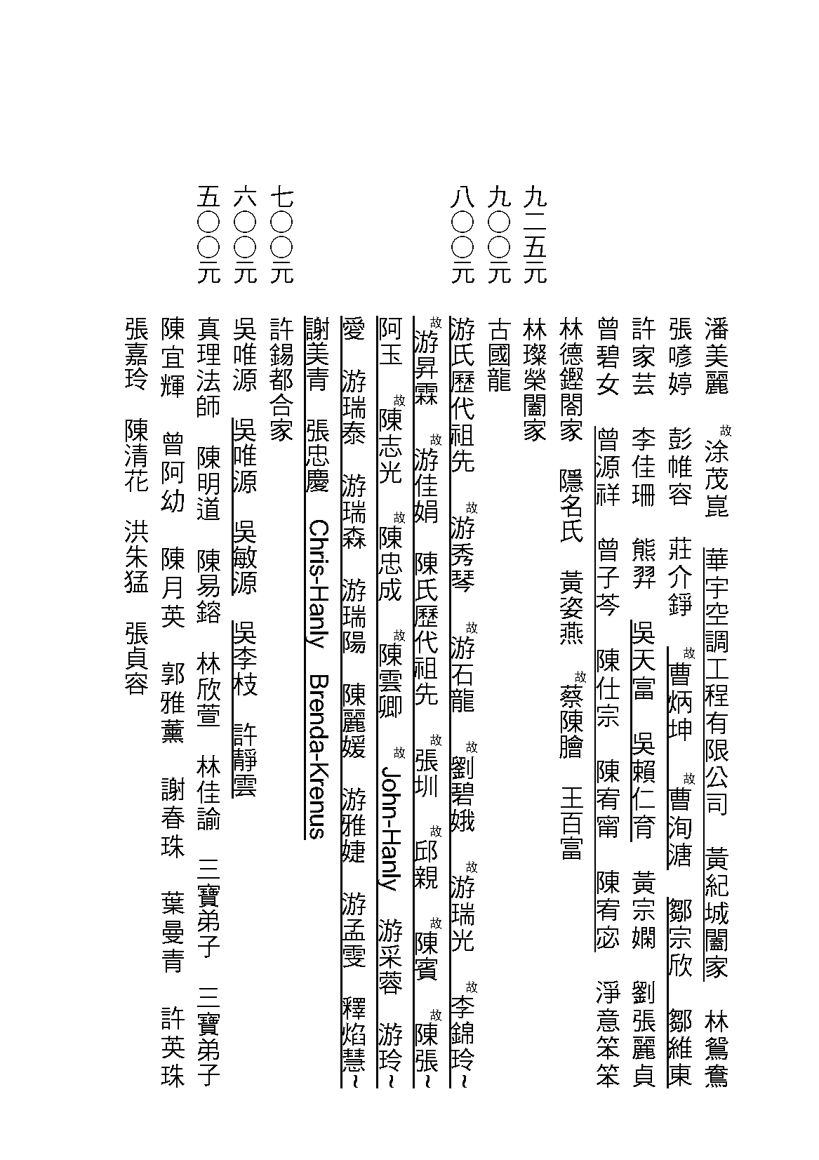 一、○○○元 (朱子辰 余來春 宏嚴法師) 黃齊堯 黃進興 黃蔡梅 林正淮 林游雀 林依蒂 林昕樺 周慧君 陳白琴 (陳秀雄 李滿珠) (故:涂茂崑) 潘美麗 (華宇空調工程有限公司 黃紀城闔家) 林鴛鴦 張喭婷 彭帷容 莊介錚 (故:曹炳坤 故:曹洵溏) (鄒宗欣 鄒維東) 許家芸 李佳珊 熊羿 (吳天富 吳賴仁育) 黃宗嫻 劉張麗貞 曾碧女 (曾源祥 曾子芩 陳仕宗 陳宥甯 陳宥宓) 淨意笨笨 林德鏗閤家 隱名氏 黃姿燕 (故:蔡陳膾) 王百富