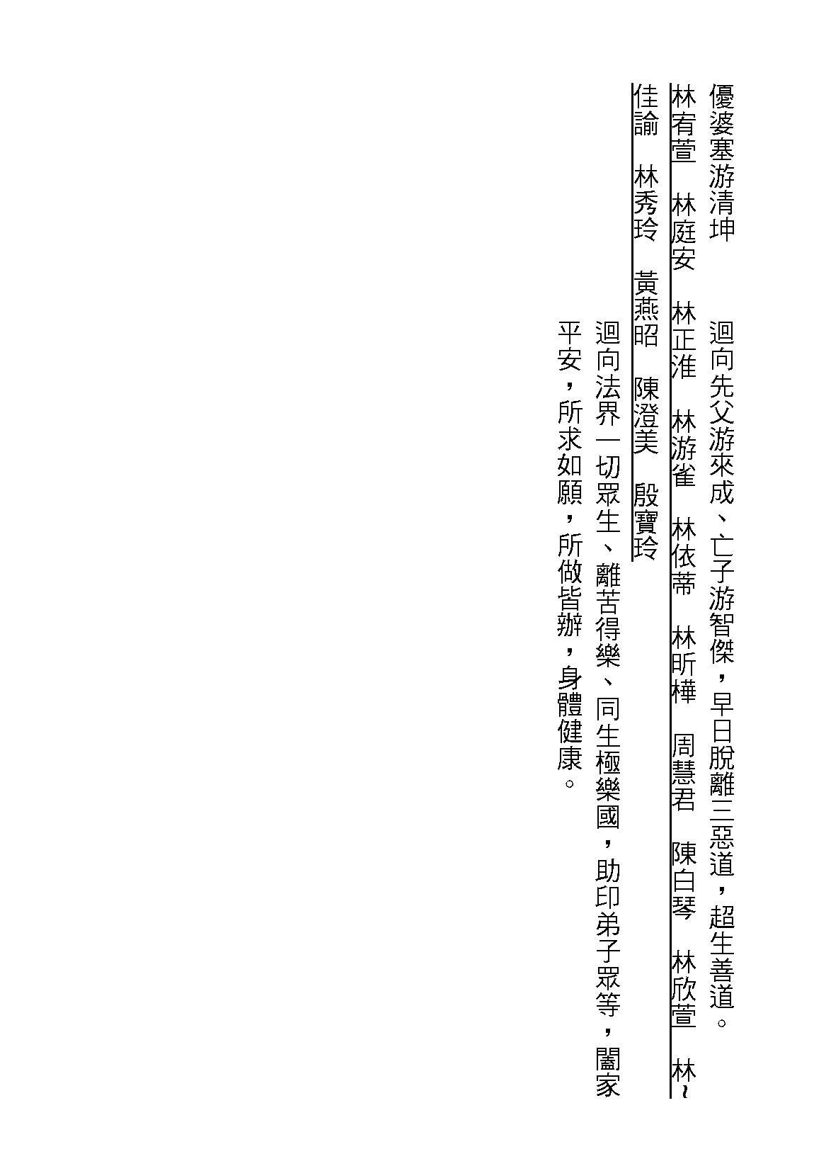 (林宥萱 林庭安 林正淮 林游雀 林依蒂 林昕樺 周慧君 陳白琴 林欣萱 林佳諭 林秀玲 黃燕昭 陳澄美 殷寶玲)-迴向法界一切眾生、離苦得樂、同生極樂國,助印弟子眾等,闔家平安,所求如願,所做皆辦,身體健康。
